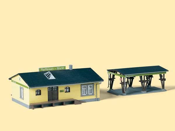Lille handels- og forsyningsbygning til landsbyscenen. Med læsseramper til sidespor og overdækket