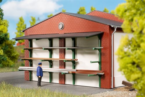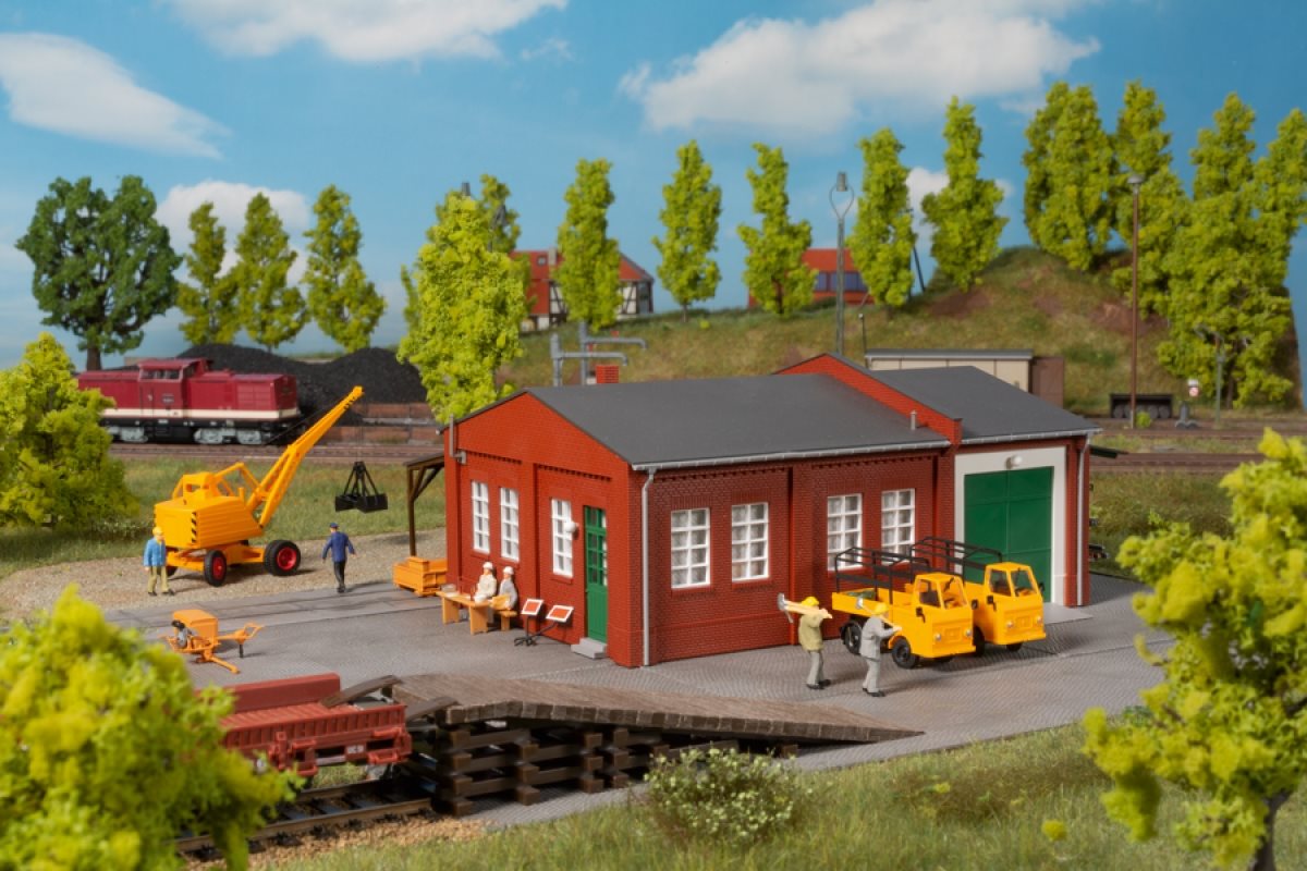 Produktet omfatter kontorlokaler kombineret med en praktisk garage, hvor små køretøjer let kan parkeres under det bageste tag. Med dimensionerne 112 x 30 x 20 mm passer denne vedligeholdelsesbygning perfekt ind i ethvert H0-skala landskab.