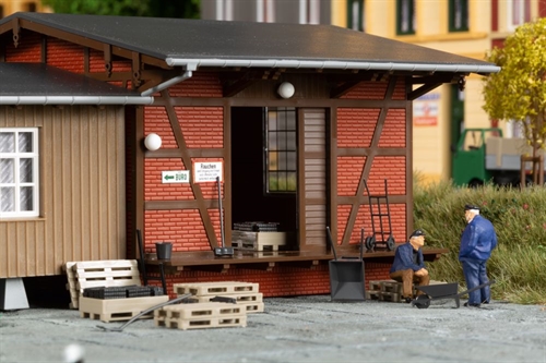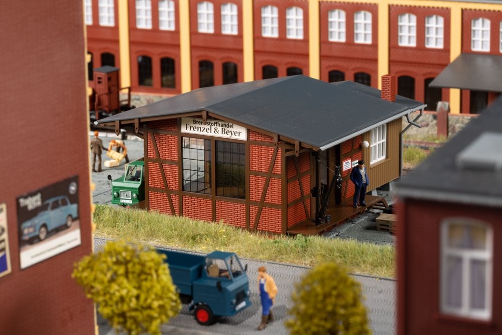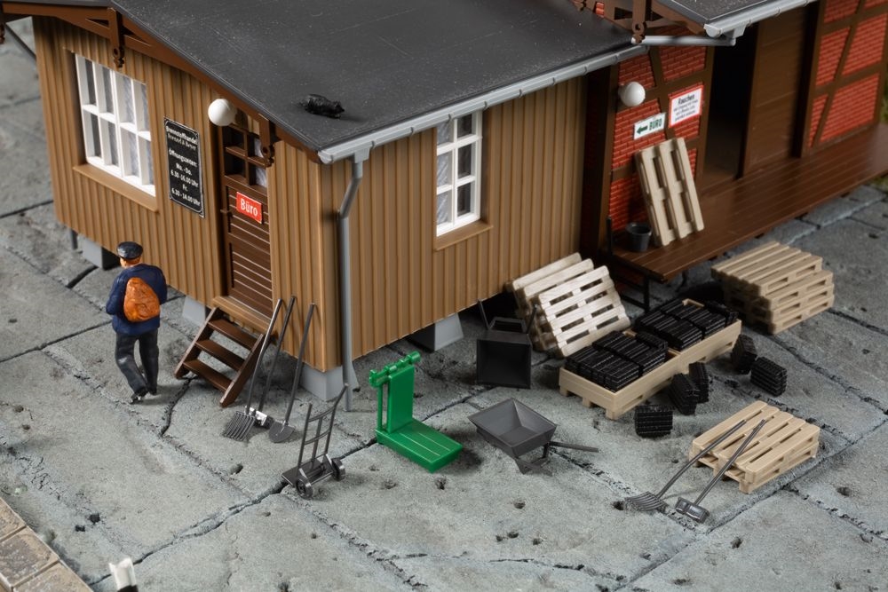 Brændstofbutikker plejede at være en  del af bybilledet næsten overalt. I vores - ret lille - model er der brændstof af alle slags.. Taskevægten bruges til at veje leverancerne for kunderne inden lastning. Til tungere varer er der en flytbar vægkran på lagerskuret. Klinker bindingsværksbygningen suppleres af en træbeklædt kontortilbygning. Sættet indeholder værktøjer til designet, såsom skovle, koste og trillebøre samt stakke af briketter og paller.