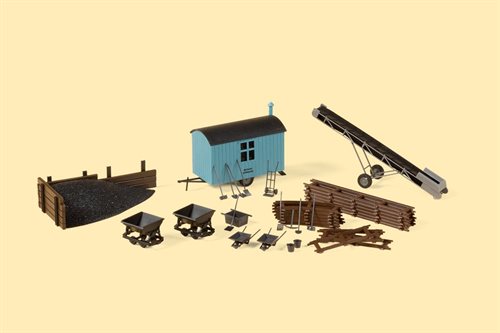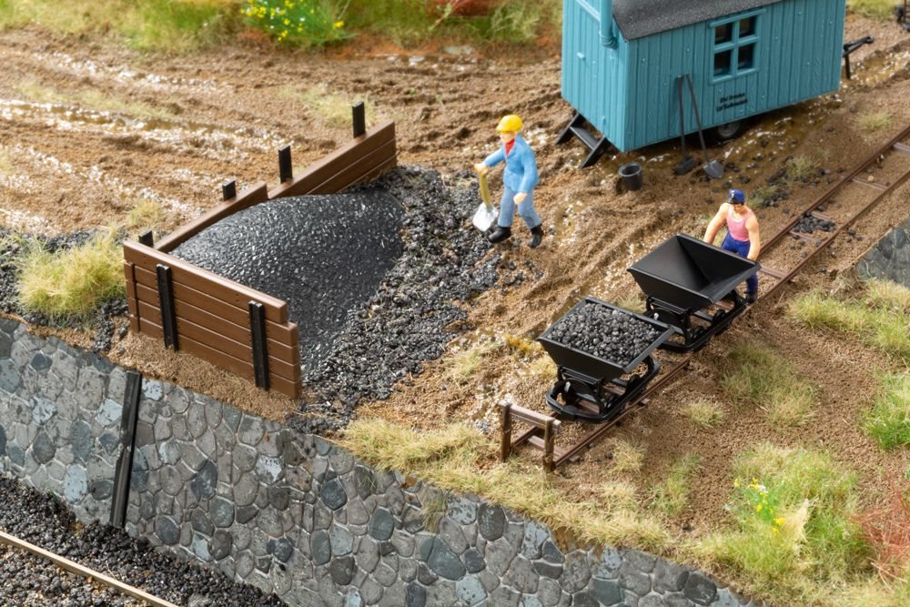 Scenen kan modelleres efter originalen med to tipvogne, lige og buede spor (640 mm total længde),