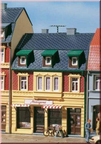 Dette nøje detaljerede byhus fra den anerkendte tyske producent Auhagen tilføjer en autentisk følelse til enhver H0-skala opsætning. Modellen måler 72 x 76 x 95 mm og repræsenterer en klassisk europæisk bygning med en tiltalende slagterbutik på stueetagen.