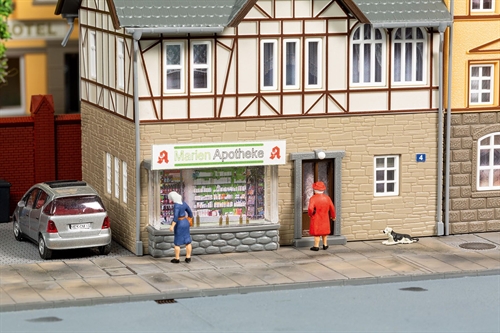 Produktinformation "Beboelsesbygninger Bahnhofstrasse 2/4" Begge huse supplerer vores serie af beboelsesejendomme i Bahnhofstrasse. Det toetagers hus har bindingsværk, og stueetagen huser et apotek. Det treetagers hus har kontrasterende stukelementer.