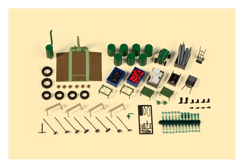 En sakselift, en ovn, flere tønder, en tøndevogn, 4 transportkasser, flere dæk samt fælge, flasker, glas, gasflasker, kasser, bukke og værktøj, også i laserskåret, efterlader ikke mere at ønske for at åbne et model mekaniker værksted!