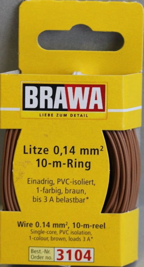 **Brawa 3104 Ledning - Brun, 0,14 mm, 10 Meter**Opdag den højkvalitets Brawa 3104 ledning, perfekt til dine modelbygningsprojekter og elektriske installationer. Denne ledning fra anerkendte Brawa er en essentiel komponent til enhver hobbyentusiast eller professionel, der kræver pålidelig og holdbar ledning.
