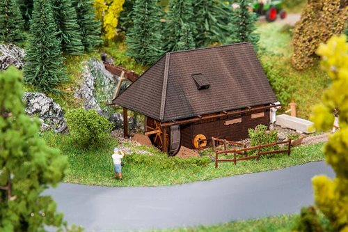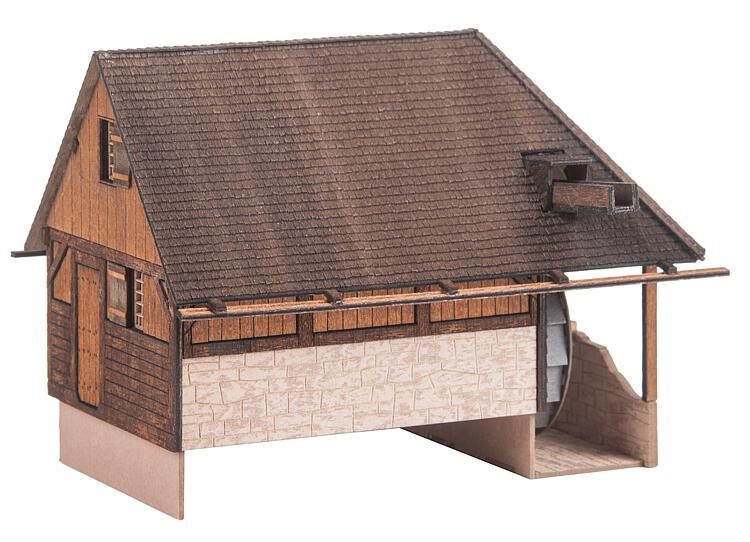 Laserskåret model af en historisk kornmølle med spåntag baseret på en original i "Guyenbach-dalen".