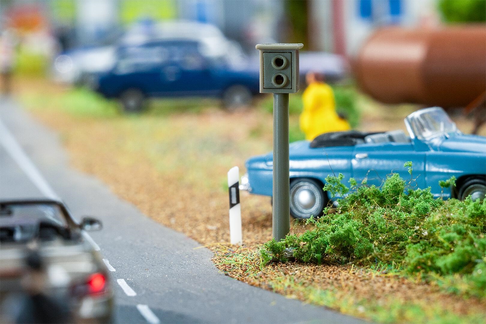 Hastighedsfælden er udstyret med en meget lys LED og kan forbindes med en modstand forberedt til 12–16 V jævnstrøm. Når den indbyggede sensor (Art. 161773, ikke inkluderet), aktiveres lommelygten. En hastighedskameraboks kan bygges til H0 eller N.