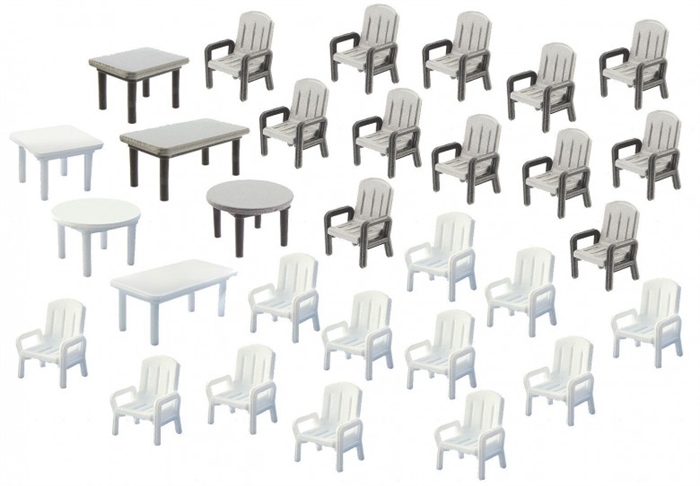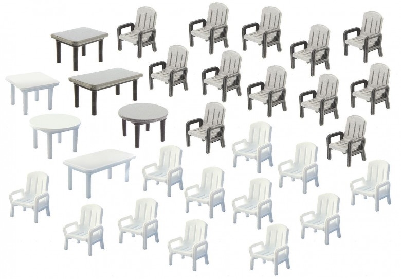 **Opgrader din modeljernbane med Faller 180439 Byggesæt - 24 Havestole og Seks Borde i Skala H0**