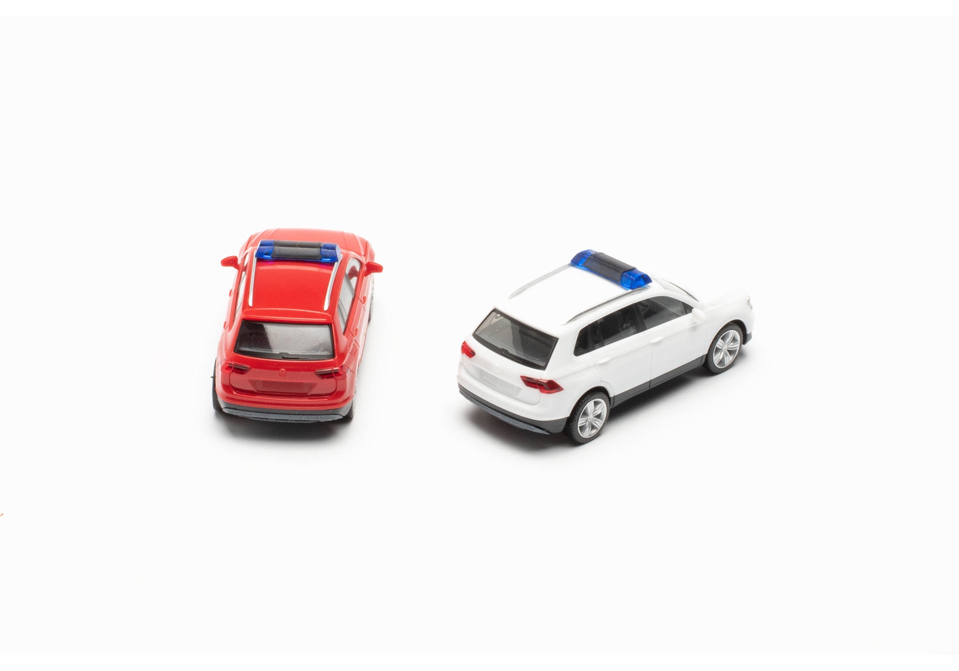 Indeholder: - 2 x VW Tiguan modeller med advarselsbjælker - Farver: 1 rød og 1 hvid - Skala: H0 (1:87)