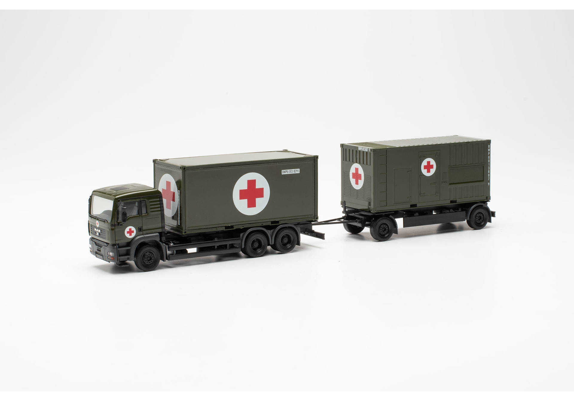 Introducerer Herpa 747042 MAN TGA L containertrailer "Bundeswehr/SAN" – en uundværlig model for enhver samler med interesse for militære køretøjer og logistiske operationer. Denne nøje designede modeltrailer er en tro kopi af det originale MAN TGA L køretøj, udstyret med en standard SAN container og en strømgenerator, som er essentielle for driften af mobile felthospitaler.