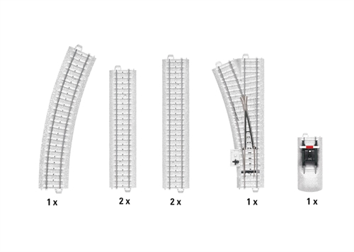 Indhold: 2 lige spor 171,7 mm, 2 lige spor 188,3 mm, 1 buet spor (kontaktkurve), 1 kontakt til venstre og 1 bufferstop i hvidt med glittereffekt. Forsamling.