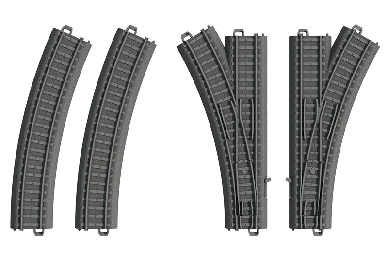 inkluderer 1 venstre sporskifte, 1 højre sporskifte og 2 buede skinner fremstillet af stabil og