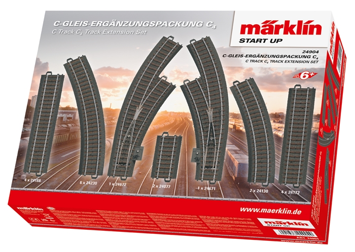 C skinne udvidelsessæt C4, består af: * 4 x Lige spor 24188 * 4 x Lige spor 24172 * 2 x Lige spor 24077 * 2 x Kurvespor 24130 * 6 x Kurvespor 24230 * 1 x sporskifte 24671 * 1 x sporskifte 24672 * Tilslutningsmateriale.