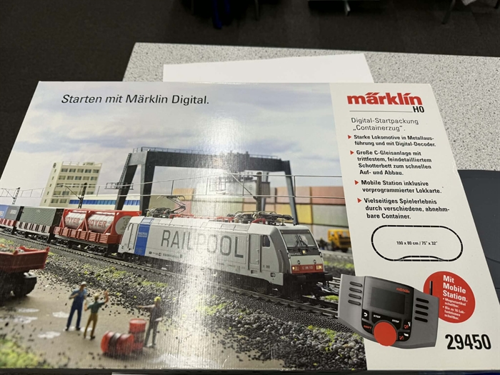 Märklin 29450 Startsæt "Container Tog" med lokomotiv, vogne, skinner samt mobilestaion (BRUGT)