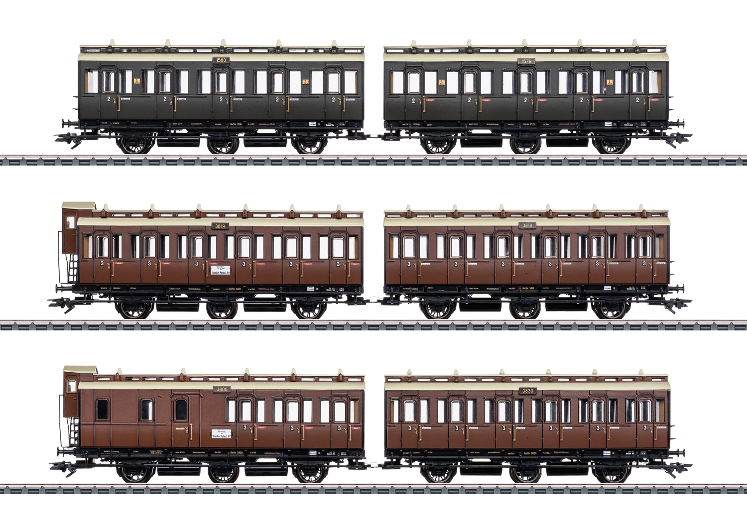 Model: Alle vogne med standard indbygget LED indvendig belysning med buffer opbevaringstanke og strømførende koblinger. Vognenheden kan forsynes med elektricitet via damplokomotivet P 8 (artikel 39381) via de indbyggede løbende strømførende kortkoblinger. Hvert par er solidt koblet. Med løsøre central akse for bedre kurve. Hvert par vogne pakket individuelt. Samlet længde over buffer ca. 82,5 cm.