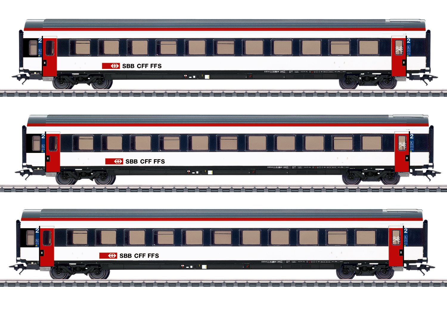Prototype: 3 schweiziske føderale jernbaner (SBB/CFF/FFS) personvogne. Standardvogn type EW IV B, 2. klasse. Design i det nuværende InterCity design, med markante røde døre. Aktuel driftsstatus.