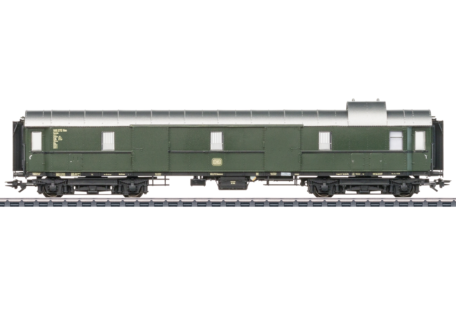 Model: Fireakslet eksprestogbagagevogn Pw4üe (standarddesign 1928 til 1930, baseret på skitse Pw4ü-29) fra Deutsche Bundesbahn (DB). Flaskegrøn grundfarve. Med buet tag og tagbeslag til lokomotivføreren, adgangsstiger på forsiden og bælgeovergange. Driftstilstand for epoke IIIb.