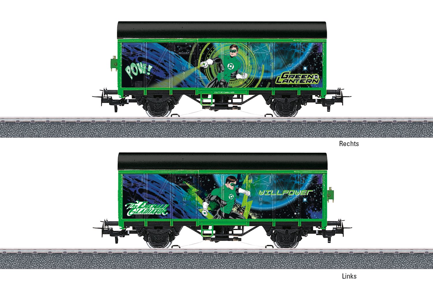 2 Akslet lukket godsvogn baseret på superhelten "Green Lantern" forsynet med slæbesko og lysende slutlanterne.