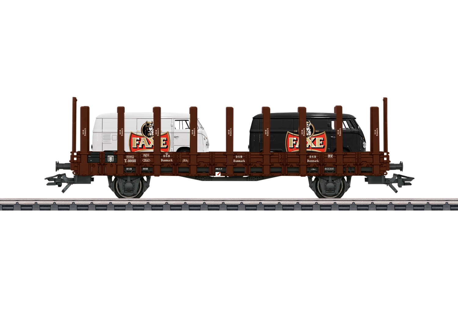 Model: Med separat påsatte sprængværk. Lastet med to VW T1 "Bulli" i designet af bryggeriet FAXE. Køretøjer fra Schuco. Plug-in stanchions og beslag til de to køretøjer er inkluderet. Længde over puffer 13,9 cm. DC hjulsæt E700580.