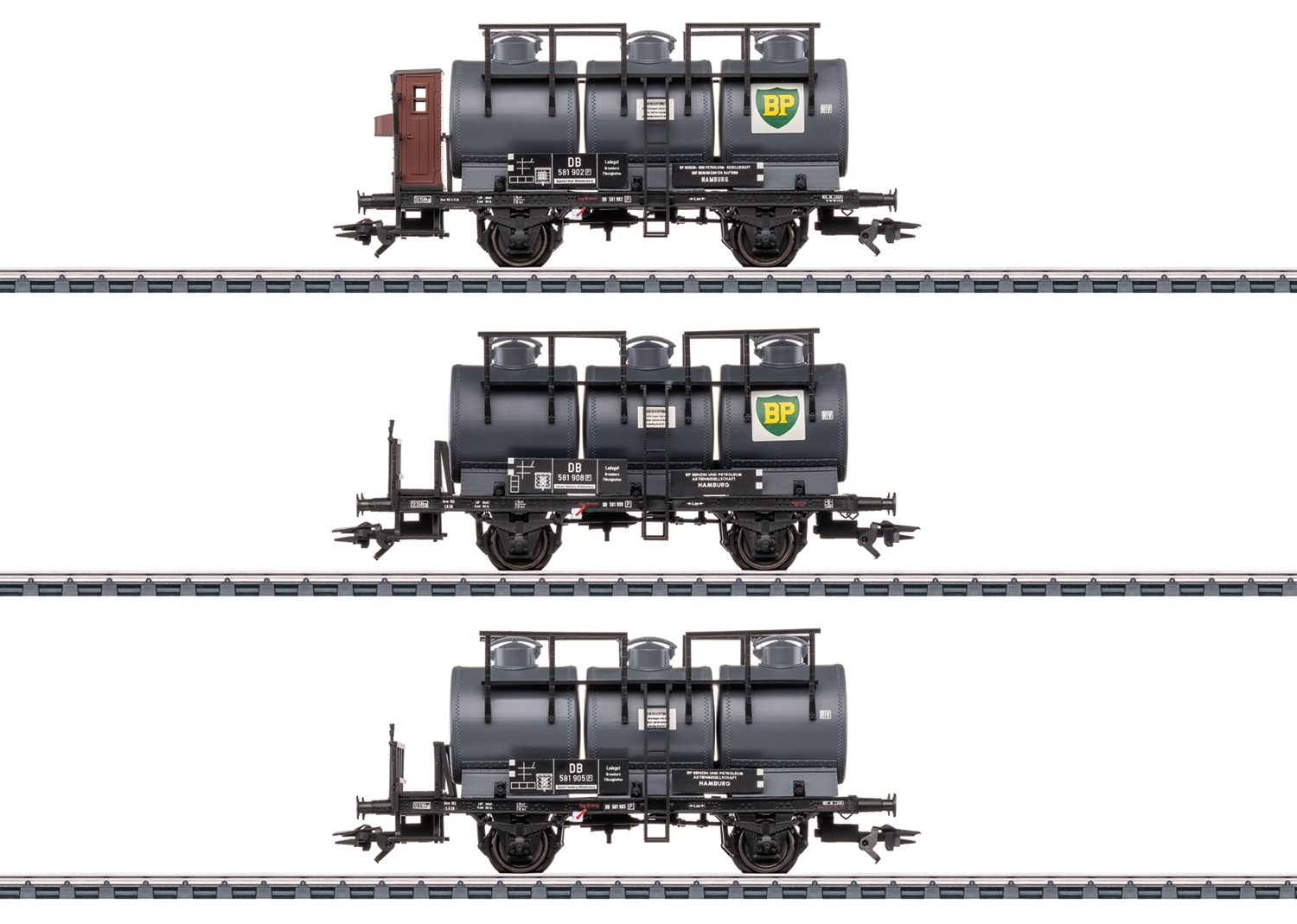 Forbillede: Tre tankvogne med to hjulsæt og tre containere hver fra Hamburg Petrol and Petroleum Company, ansat af Deutsche Bundesbahn (DB). Driftstilstand i slutningen af 1950'erne.