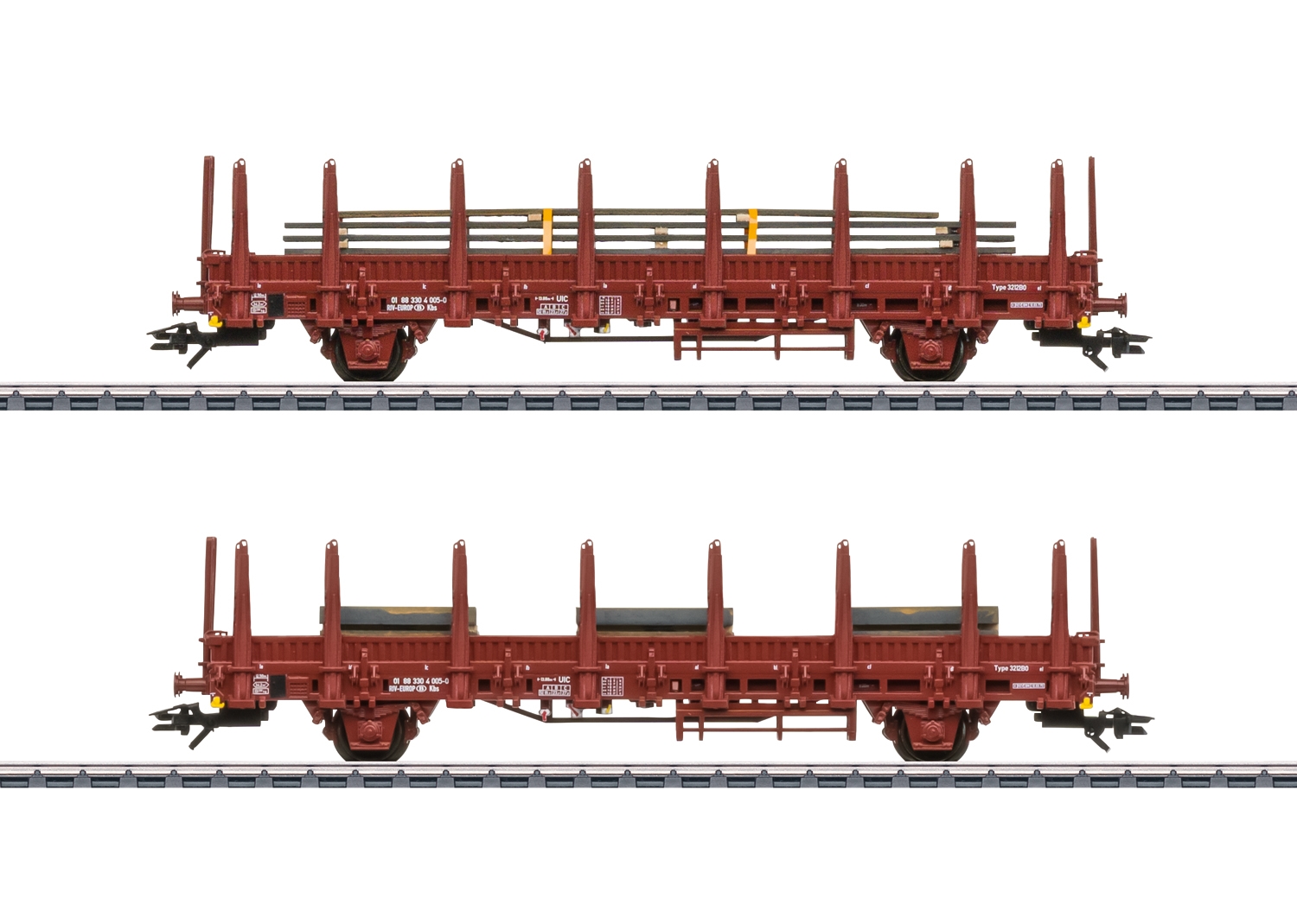 Model: En stavvogn lastet med replika stålplader, en stavvogn lastet med replika stålplader. Hver stavsbil leveres med stanchions til indsættelse. Begge vogne pakket individuelt med ekstra ydre emballage. Samlet længde over buffer 31,6 cm. DC hjulsæt E700580.