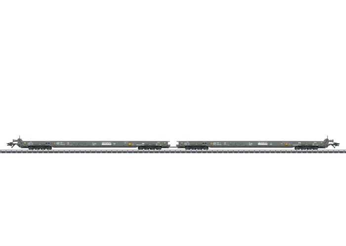 Model: Vognkarosserie lavet af metal. Med to drejelige og aftagelige bufferplanker. Tilbageholdende kiler til lastbilmodeller, specielle koblinger til lavgulvskøretøjer og specielle tætte koblinger til kobling til køretøjer med normal kobling er inkluderet. Kan også kobles til køretøjer med lav bufferhøjde. Begge vogne blev individuelt pakket i ekstra ydre emballage. Samlet længde over buffer ca. 44,6 cm. DC-hjulsæt E432950.