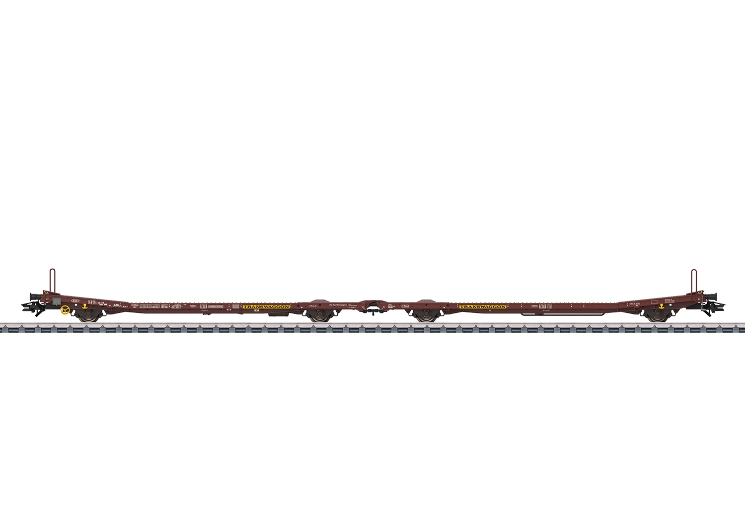 Model: Begge halvdele af den flade vogn er lavet af metal. Mange separat fastgjorte detaljer såsom bremseledninger, lufttanke, køreplader, trin og bremsestænger. Med håndhjul til parkeringsbremse. Bufferhøjde ifølge NEM. Kinematisk styret, stiv skruekobling mellem vognhalvdelene. Støttekiler til toppen af ​​vognen, støttekiler til bunden af ​​vognen og bremseslanger medfølger som separat fastgørbare dele. Lastet med fire VW Crafter fra Schuco.