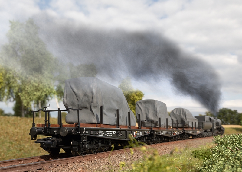 Prototype: Tre 6-akslede SSyms Köln tunge flad vogne til transport af tung gods. Tyske Statsjernbane (DR). Håndbremser, platformsrækværk, pæle og bremser, der kan indstilles fra jorden er inkluderet. Hver vogn er læsset med et køretøj under en beskyttende presenning. Vognene ser ud, som de gjorde omkring 1942.