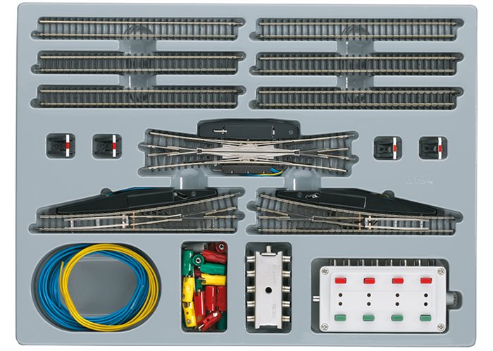 Indhold: 10 lige skinner, 1 dobbelt sporskifte, 2 elektromagnetiske kontakter, 4 bufferstop,