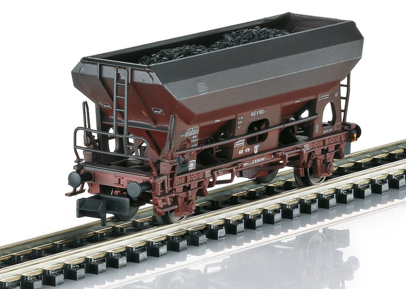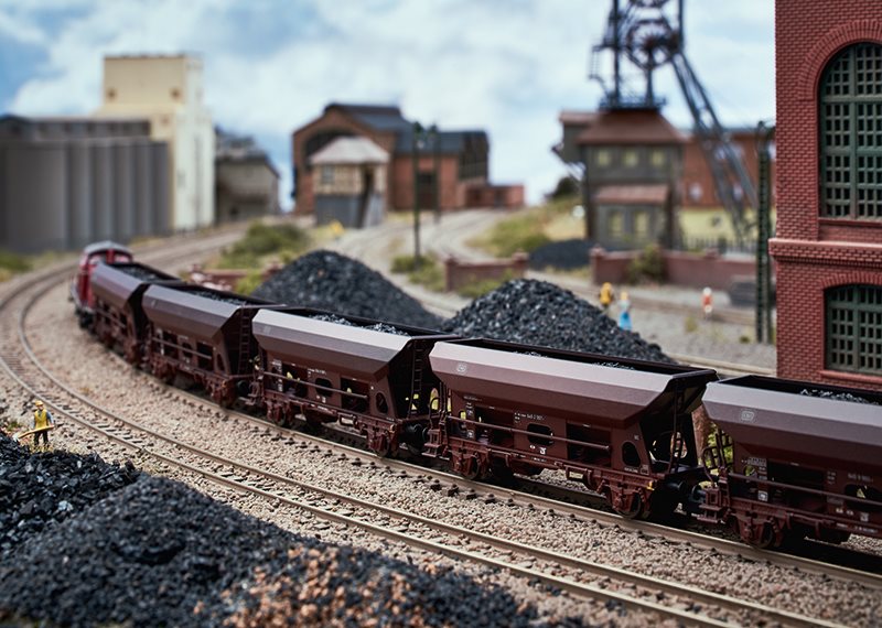 Minitrix 15536 Femvogns sidekip vognsæt belæsset med kul samt godsbygning, DB ep IV