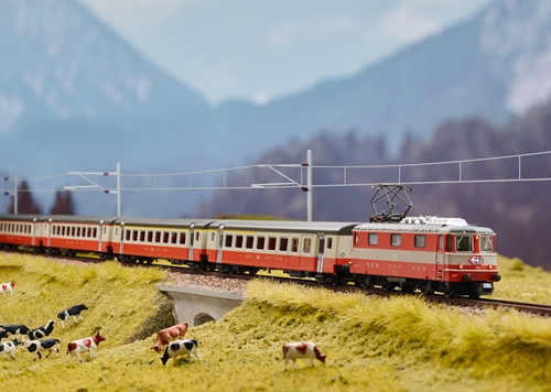 Prototype: Elektrolokomotiv 11141 fra Schweiziske forbundsjernbaner (SBB) (Re 4/4 II). Hjularrangement Bo'Bo', bygget fra 1966 til SBB. Driftstilstand fra december 1974. Grundfarveskema i blodorange / småstensgrå, med runde lamper og strømaftager. Anvendelse: Swiss Express.