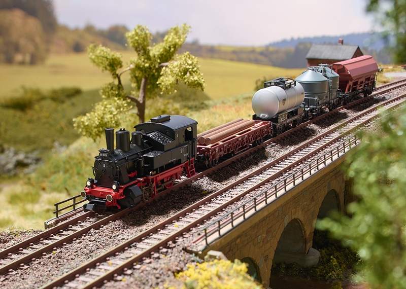 König Dampf und das deutsche WirtschaftswunderNach der Gründung der Bundesrepublik Deutschland erlebten die jungen Staatsbahnen eine beeindruckende Blütezeit während des Wirtschaftswunders in den 1950er und 1960er Jahren. Obwohl die Entwicklung moderner Diesel- und Elektrolokomotiven zu dieser Zeit begann, blieben Dampflokomotiven noch viele Jahre unverzichtbar. Bis Ende 1958 waren noch etwa 9000 Dampflokomotiven im Einsatz, die über 60% der gesamten Lokomotivkilometer abdeckten. Nicht nur der Personenverkehr florierte, sondern auch der Güterverkehr mit der Bahn erlebte einen unerwarteten Boom. Fast jede Stadt verfügte über eine Güterumschlagsanlage, überall gab es Anschlussgleise für Güterkunden, und selbst kleine, oft abgelegene Bahnhöfe wurden als Gütertarifpunkte erreicht; Linienstilllegungen standen kaum zur Diskussion. Zu dieser Zeit wurden die wartungsintensiven Dampflokomotiven normalerweise in drei Schichten in den vielen Eisenbahndepots gewartet. Dies galt auch für das bayerische Depot in Ansbach, wo 1961 noch 370 Mitarbeiter 19 Dampflokomotiven und 19 Verbrennungsmotoren betreuten. Selbst Veteranen der Bayerischen Staatsbahnen wie Baureihe 89.8 (bayerische R 3/3) verrichteten Rangierdienste am Bahnhof und fuhren auf den Nebenstrecken nach Bechhofen und Windsbach. Die kräftige, aber langsame 16 R 3/3 war selten auf der Strecke, sondern bediente eher Verbindungen im Stadtgebiet. Gelegentlich mussten sie jedoch die flinke Pt 2/3 ersetzen, und dann begann der Dienst oft um 3:27 Uhr mit dem lokalen Güterzug 8967 nach Bechhofen mit einer Reisezeit von zwei Stunden für etwa 32 Kilometer. Zu dieser Zeit bestand eine solche Belastung normalerweise aus unterschiedlichen Typen von Güterwagen. Danach fuhr sie mit einem Personenzug aus alten zweiachsigen Fahrzeugen zurück, und die ältere Bayerische verbrachte den Rest des Tages mit Rangier- und Zustellungsfahrten. Bis Anfang der 1960er Jahre prägten solche Lokomotiven und Züge noch den Alltag in der gesamten Bundesrepublik Deutschland als eine kleine, aber feine Detailansicht der legendären Wirtschaftswunderperiode. Das neue MINITRIX-Set ist daher ein Juwel auf jeder Epoch III-Anlage.Modell: Tanklokomotive 89 826 (ehemals Klasse R 3/3 der K.Bay.Sts.B.) der Deutschen Bundesbahn (DB). Achsanordnung C n2t, gebaut ab 1898, Betriebszustand ab 1959 (BD Nürnberg / Bw Ansbach).