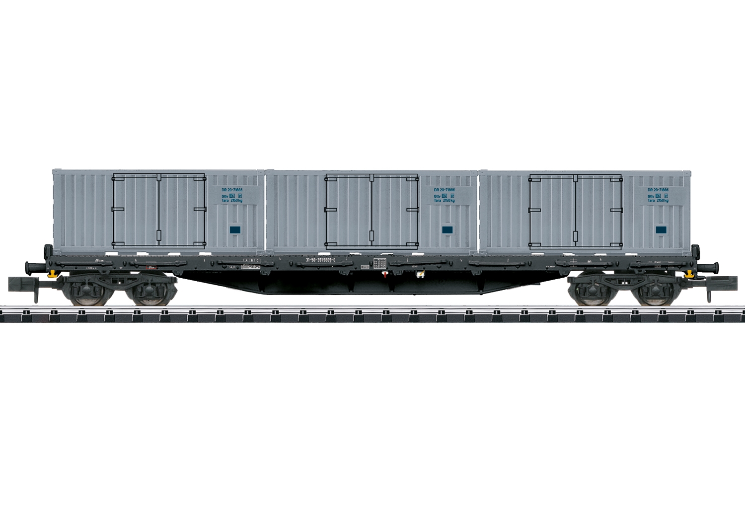 Forbillede: Tysk Reichsbahn (DR) type Rgs 3910 flad bil. Europæisk standardvogn med en længde på 19,90 m. Læsset med tre 20 fods postcontainere.