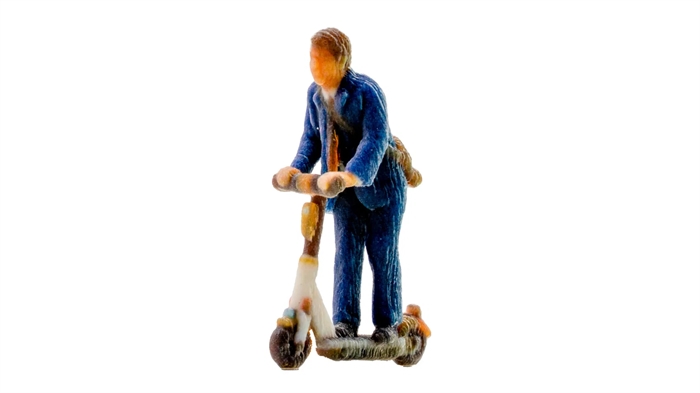 Takket være topmoderne 3D-printteknologi kan de fineste detaljer som tøj, kropsholdning og selve e-scooteren ses knivskarpe. Den omhyggelige håndmaling giver figuren et særligt livligt udseende.