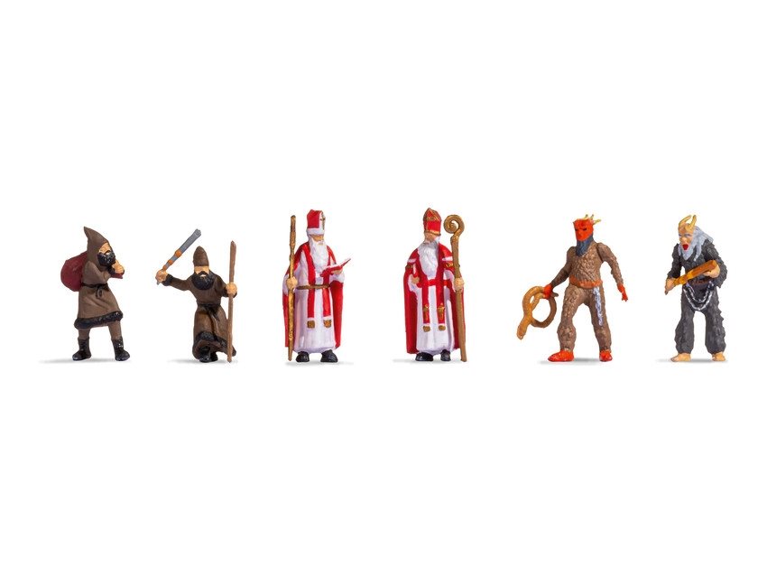 Produktet indeholder seks detaljerige figurer, der repræsenterer den elskede Sankt Nikolaus og hans hjælper, tjener Ruprecht. Figurene er omhyggeligt håndmalet og udtrykker livlige og karakteristiske træk, hvilket gør dem til en perfekt tilføjelse til din juleudsmykning. Med en skala på 1:87 passer disse figurer perfekt ind i standard H0-miljøer, hvilket gør dem ideelle for modeljernbaneentusiaster og samlere.