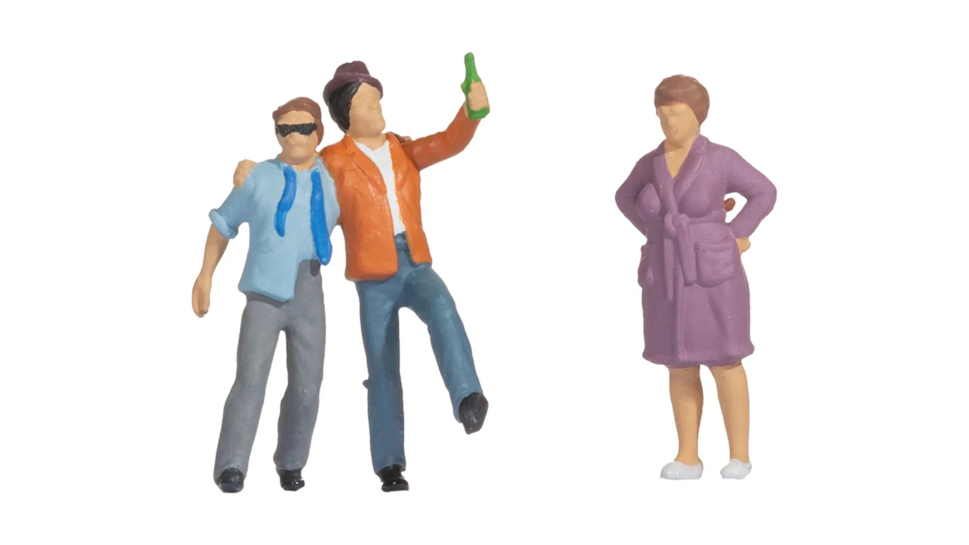 Med Funny-Scenes "Saufbrüder" bringer NOCH en sjov og realistisk scene til dit modeljernbanelayout! Denne gruppe af figurer viser to godmodige venner, der tydeligvis har forkælet sig selv med en munter aften og nu er på vej hjem arm i arm og med en flaske i hænderne. Men den tredje karakter, en resolut dame i badekåbe, venter på de to med foldede arme og et kritisk blik – hun er tydeligvis ikke begejstret for sine "drikkebrødres" natlige forehavender!
