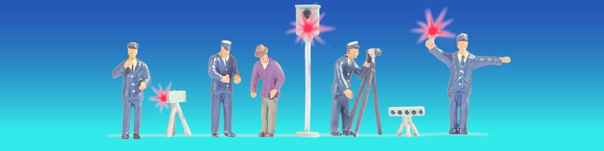 Produktet indeholder fem nøje udformede figurer, der repræsenterer tyske politibetjente, komplet med relevant tilbehør for at skabe livlige og troværdige scener. Highlightet i dette sæt er to fotofælder udstyret med blitzeffekt-elektronik, som tilføjer en dynamisk og interaktiv dimension til din modelbane. Derudover inkluderer sættet en figur med et lysende rødt stopskilt, som ikke blot forhøjer realisme, men også fungerer som et fascinerende visuelt element i din modeljernbane landskab.