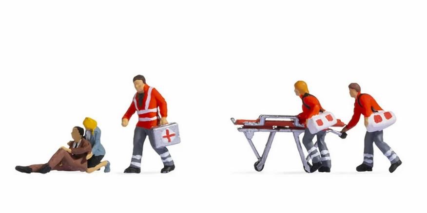 Figursættet til N sporvidde indeholder seks figurer og en redningsbåre. De to paramedicinere med