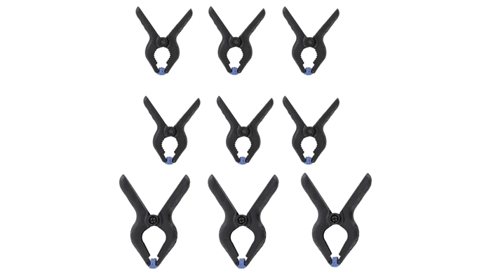 Sættet indeholder i alt ni klemmer, som leveres i forskellige størrelser. Takket være de fleksible klemmekæber med skridsikre grebflader holder de sikkert på forskellige materialer som træ, plastik, pap eller metal.