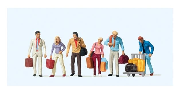 Preiser 10115 Rejsende, gående med kufferter og bagagevogn, seks personer, H0