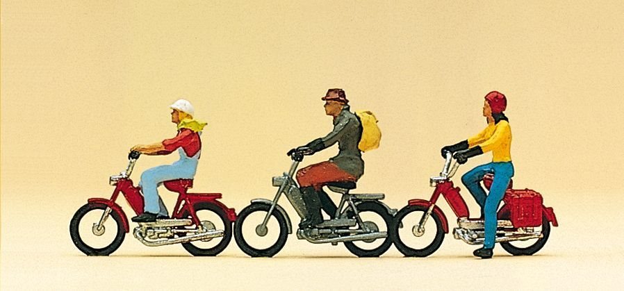 Opgrader din modeljernbane eller diorama med Preiser 10125 Knallertkørere, som kommer i en pakke med tre figurer i skala H0. Disse nøje detaljerede modeller repræsenterer knallertkørere, der tilføjer et livligt og realistisk touch til ethvert miniaturmiljø.