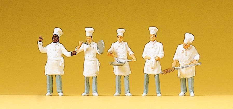 Integrer 'Preiser 10329 Kokke, fem figurer, H0' i dit layout for at skabe autentiske og indbydende scener, der fanger øjets opmærksomhed og fremhæver din passion for detaljer. Bestil dit sæt i dag og bring dine miniatureverdener til liv med Preiser's kvalitetsfigurer!