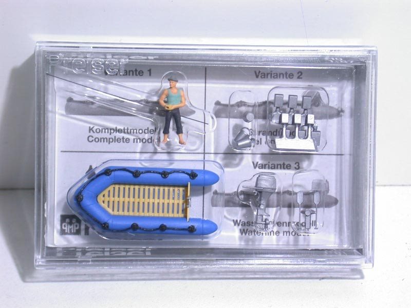 Denne særlige sæt indeholder en figurskildring af en fisker siddende i en gummibåd, perfekt fanget i midten af sin aktivitet. Detaljerne i både fiskeren og gummibåden er nøje udarbejdet for at skabe en livagtig scene, der kan vække enhver modeljernbane til live. Fra fiskerens koncentrerede ansigtsudtryk til de realistiske detaljer på gummibåden, hver del er designet med øje for kvalitet og realisme.
