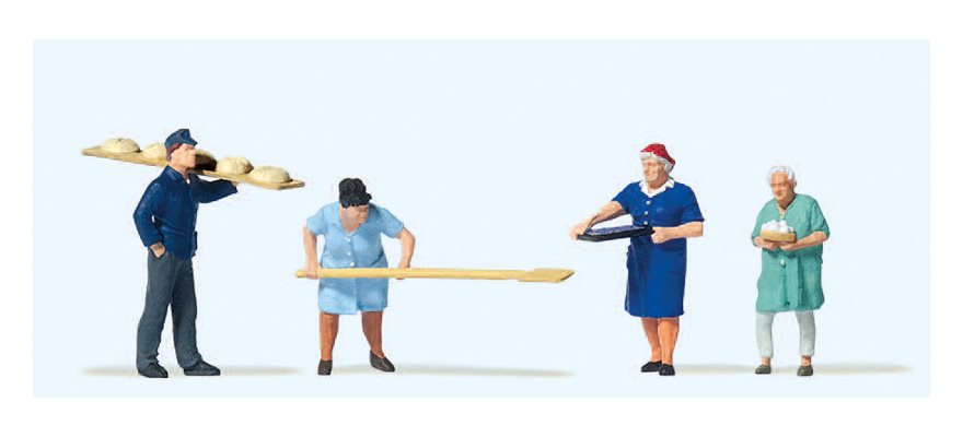 Figurene er omhyggeligt udformet for at fange nuancerne ved bagerbesøg, fra en bager med bagværk i hænderne til kunder, der venter spændt på deres tur. Hver figur står ud med fine detaljer, som viser Preisers engagement i kvalitet og livagtighed.
