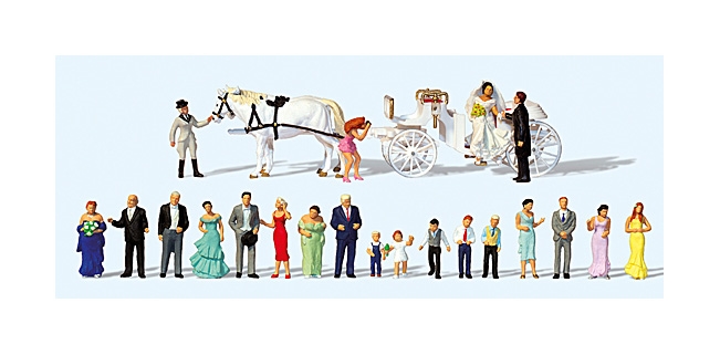 Opdag magien ved en mindeværdig dag med Preiser 13011 Bryllupsselskab med karet i skala H0. Dette detaljerede sæt bringer den romantiske atmosfære af et bryllup til dit modeljernbaneanlæg eller diorama. Sættet indeholder en smukt dekoreret hestetrukken karet, en lykkelig brud og brudgom, samt gæster klædt i festtøj, der tilføjer liv og realisme til enhver scene.