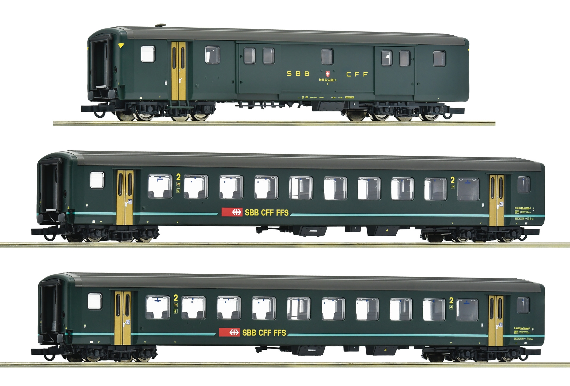 Sæt (1) med to vogne og en bagagevogn til Interregio-toget 1617 fra de schweiziske statsbaner.