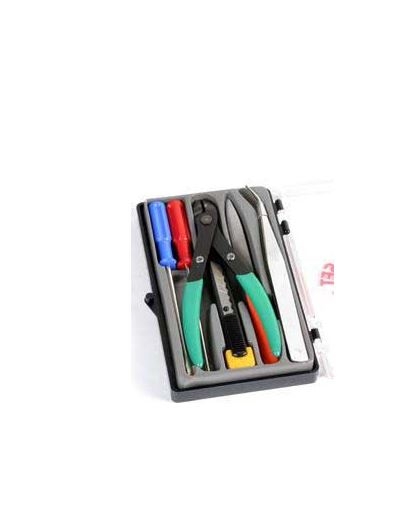 Dette sæt indeholder de grundlæggende, uundværlige værktøjer til model- og hobbyarbejde. En sideskærer til plastik, vinklede pincetter, små (+) og (-) skruetrækkere, en hobbykniv og en fil, alt sammen leveret pænt pakket i en praktisk plastikkasse.