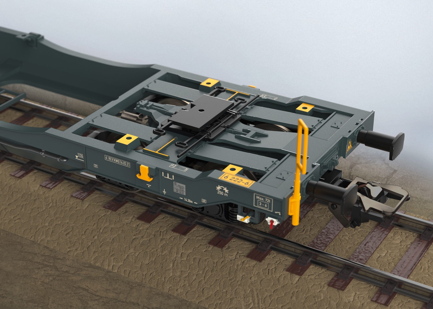 Model: Begge halvdele af vognen er lavet af metal, bevægeligt monteret på den centrale bogie. Sidehængslede låse monteret ab fabrik. Foldbar til transport af containere eller veksellad. Mange separat anvendte detaljer såsom overgangsrist, trin, bremseledninger og gribestænger i enderne af bilen. Bogier type Y25. Bufferhøjde ifølge NEM. Montering til støtteramme, beslag til kongestifter i højt og lavt design, manøvretrin og lufttank til bilens ender er inkluderet som separat monterbare dele. Læsset med to gardinpresenningssættevogne fra speditionsfirmaet Mars. Længde over buffer ca. 39,3 cm. AC hjulsæt E700150.