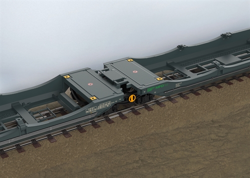 Prototype: 6-akslet dobbelt lommevogn med artikulation af Sdggmrss-design med buede sideflader fra MFD Rail GmbH. Moderne transportvogn til kombineret godstransport. Granitgrå grundfarvekombination. Version med fire sidehængslede låse. Driftstilstand fra 2021. Lastet med to gardinpresenninger fra speditionsfirmaet Mars.