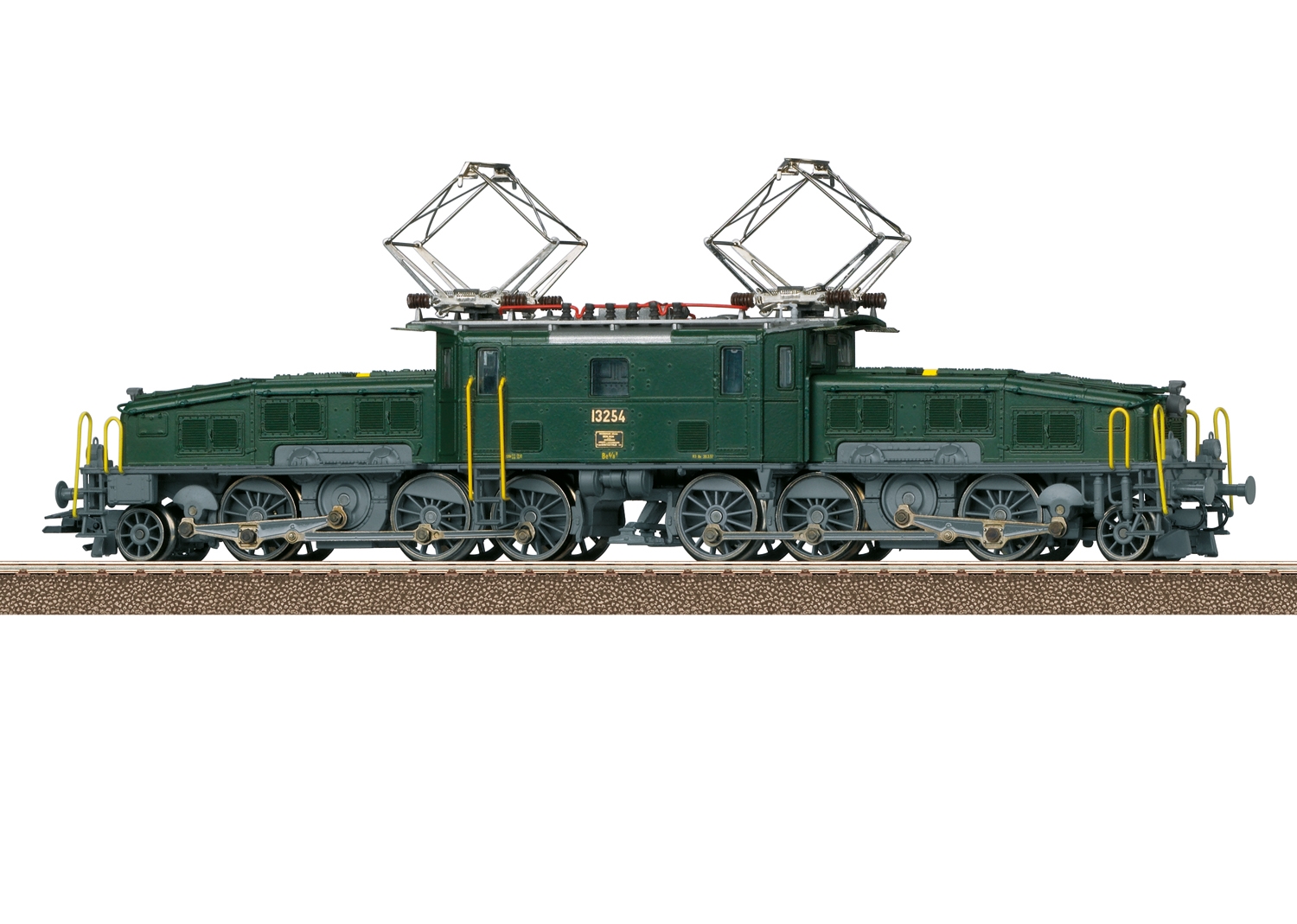 Model: Elektrisk lokomotivserie Be 6/8 II "Crocodile" fra de schweiziske føderale jernbaner (SBB). Design fra den første serie. Grangrøn grundfarve. Med 2 førerhusdøre, brede manøvretrapper på frempinden og bovformede gribestænger, muffebuffere, uden overgangsplader, med forkert kørselssignal og Signum Integra-magneter. Lokomotiv kører nummer 13254. Driftsforhold mellem 1960 og 1965.
