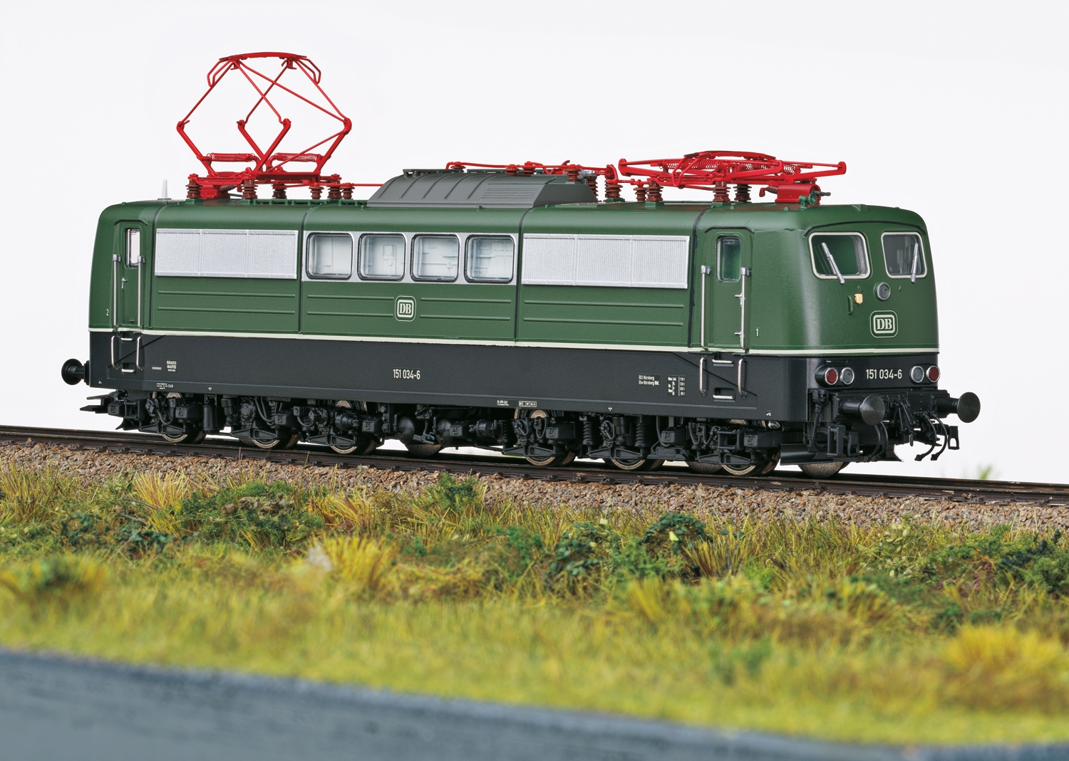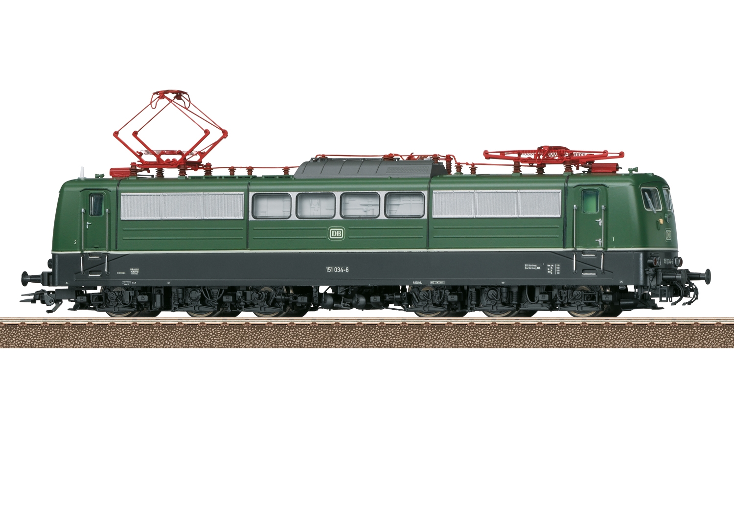 Model: Elektrisk lokomotiv klasse 151 fra de tyske forbundsbaner (DB). Chromoxid grøn grundfarve. Virksomhedsnummer 151 034-6. Driftstilstand fra 1974.